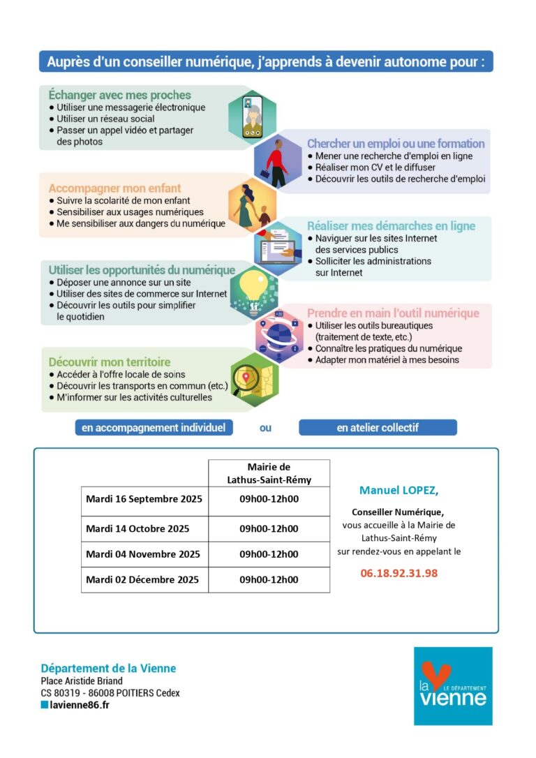Dans le cadre de la Semaine nationale des retraités et personnes âgées, la commune de Lathus-Saint-Rémy vous invite à un : ✨ Atelier de l’autonomie📅 Jeudi 9 octobre🕙 De 10h à 12h📍 Salle…