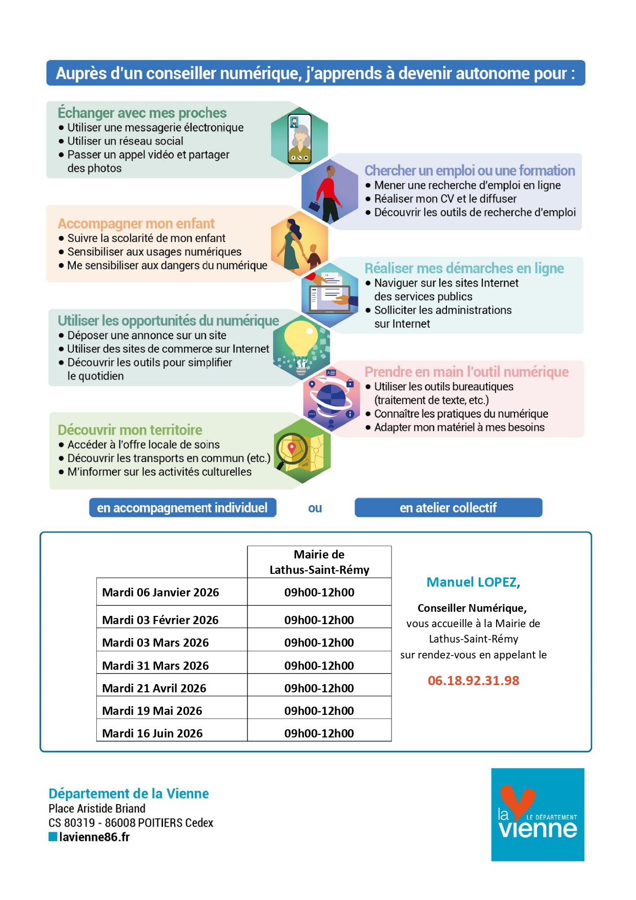 Le conseiller numérique vous accueille à la Mairie de Lathus-Saint-Rémy pour vous accompagner dans vos usages du numérique : démarches en ligne, Internet, outils numériques du quotidien.